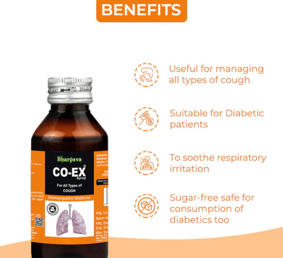 Doctor Bhargava Co-Ex Cough Syrup is a trusted Homeopathic cough syrup for all types of coughs, i.e. whooping cough, asthmatic cough, smoker’s cough, dry cough, wet cough, allergic cough, and spasmodic coughs. Its sugar-free formula makes it safe for consumption of diabetics too. It combines a blend of natural ingredients that may help to provide soothing relief from cough symptoms while being gentle on the system.